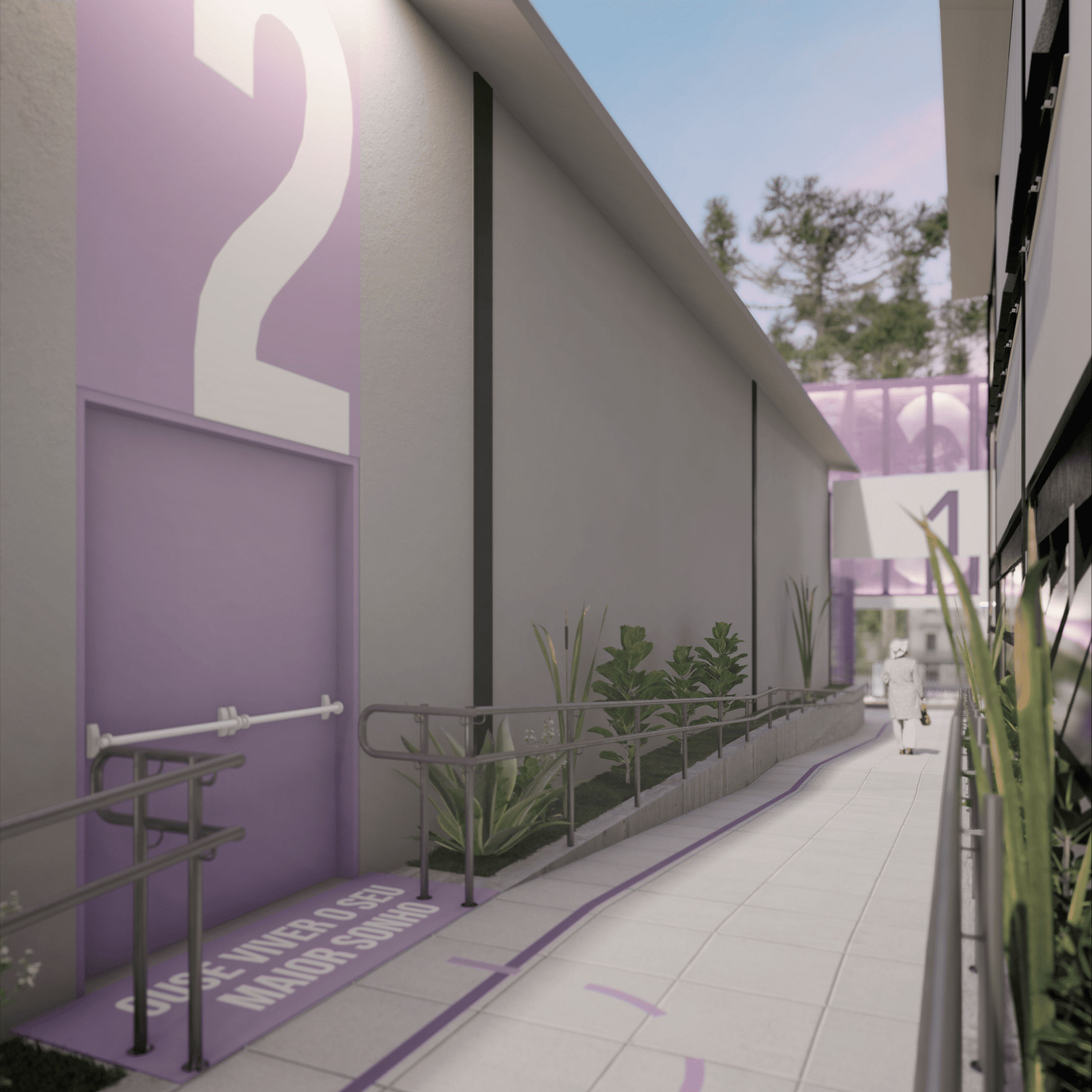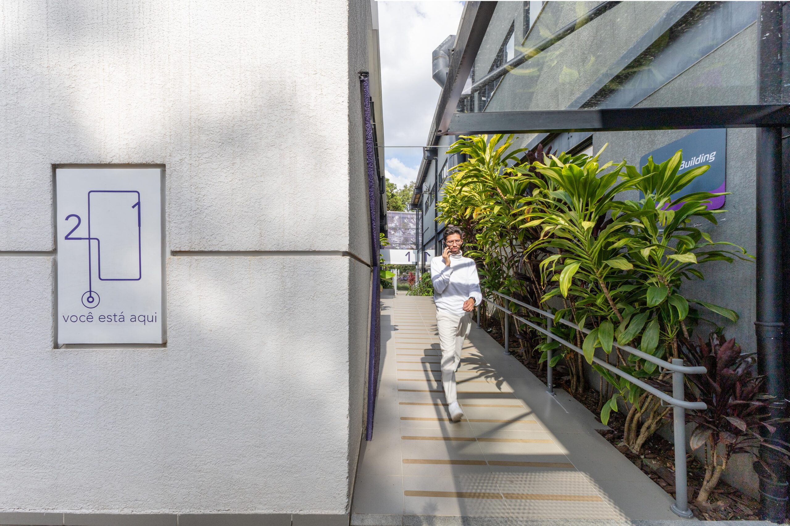 A vegetação clara, em tons lilases e esbranquiçados, potencializa o efeito da iluminação e confere ao espaço uma leitura noturna marcante, reforçando a identidade visual da marca. A comunicação visual teve o desafio de resolver com maior clareza a orientação do percurso aos visitantes, partindo de uma arquitetura que já estava consolidada e não dispunha de fluxos ideais ou ordenamento funcional lógico.