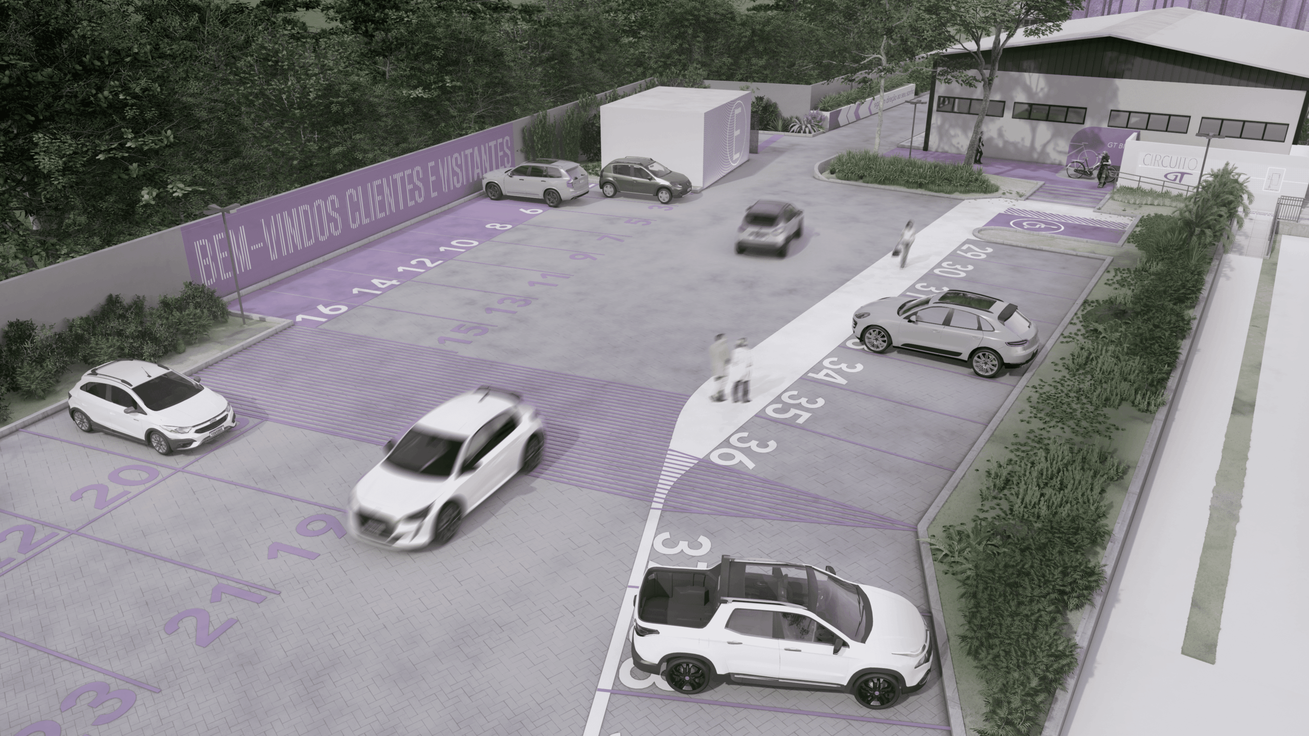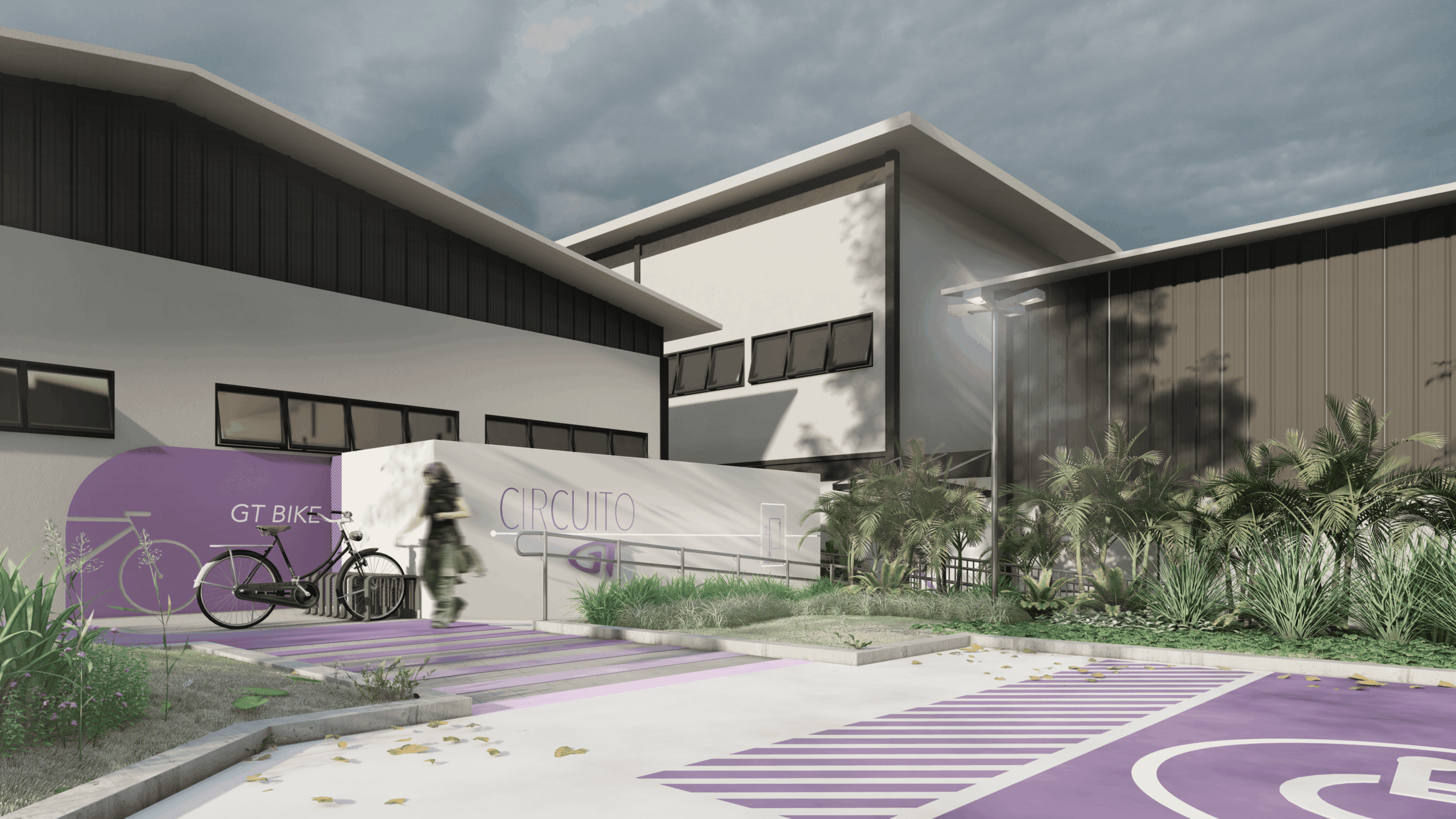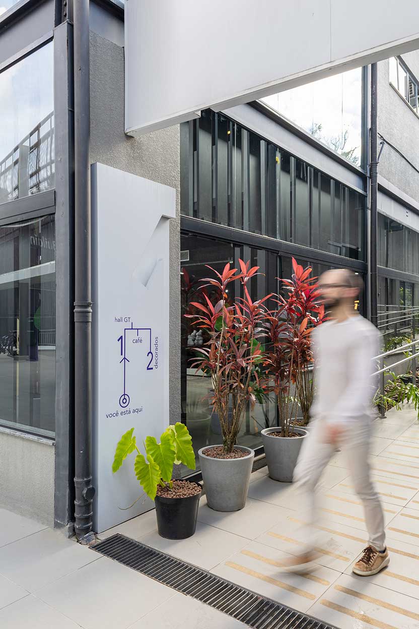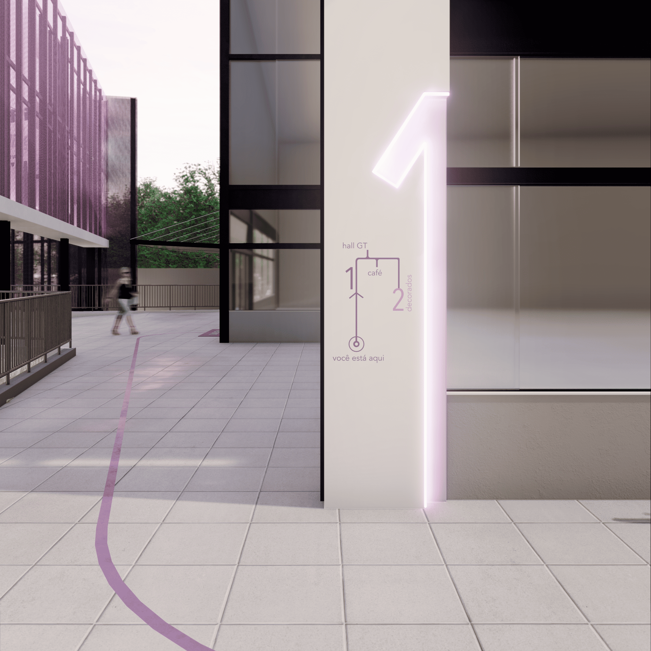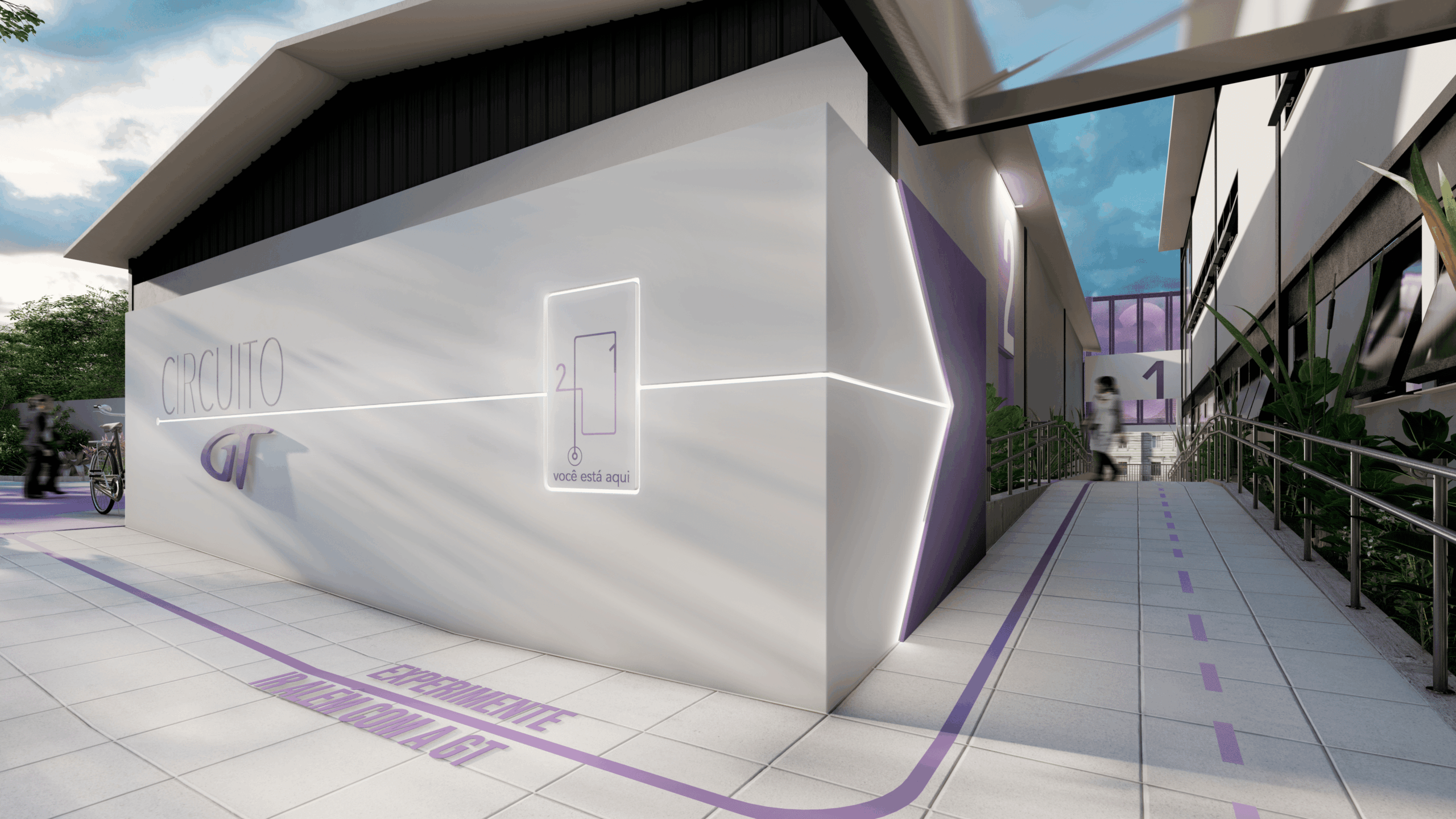 O projeto foi concebido como um prolongamento da identidade da incorporadora: inovadora, urbana e contemporânea. A proposta parte da premissa de que a paisagem não é apenas complemento, mas protagonista na atmosfera da marca. A fachada translúcida, envolta por iluminação em tons violetas, encontra no desenho do jardim uma continuidade cromática e sensorial. Os canteiros sinuosos com vegetação de porte baixo e médio criam uma moldura que suaviza as linhas rígidas da edificação, agregando ao acesso uma experiência também olfativa, já que as espécies adotadas foram pensadas para criar uma paisagem olfativa específica da GT.