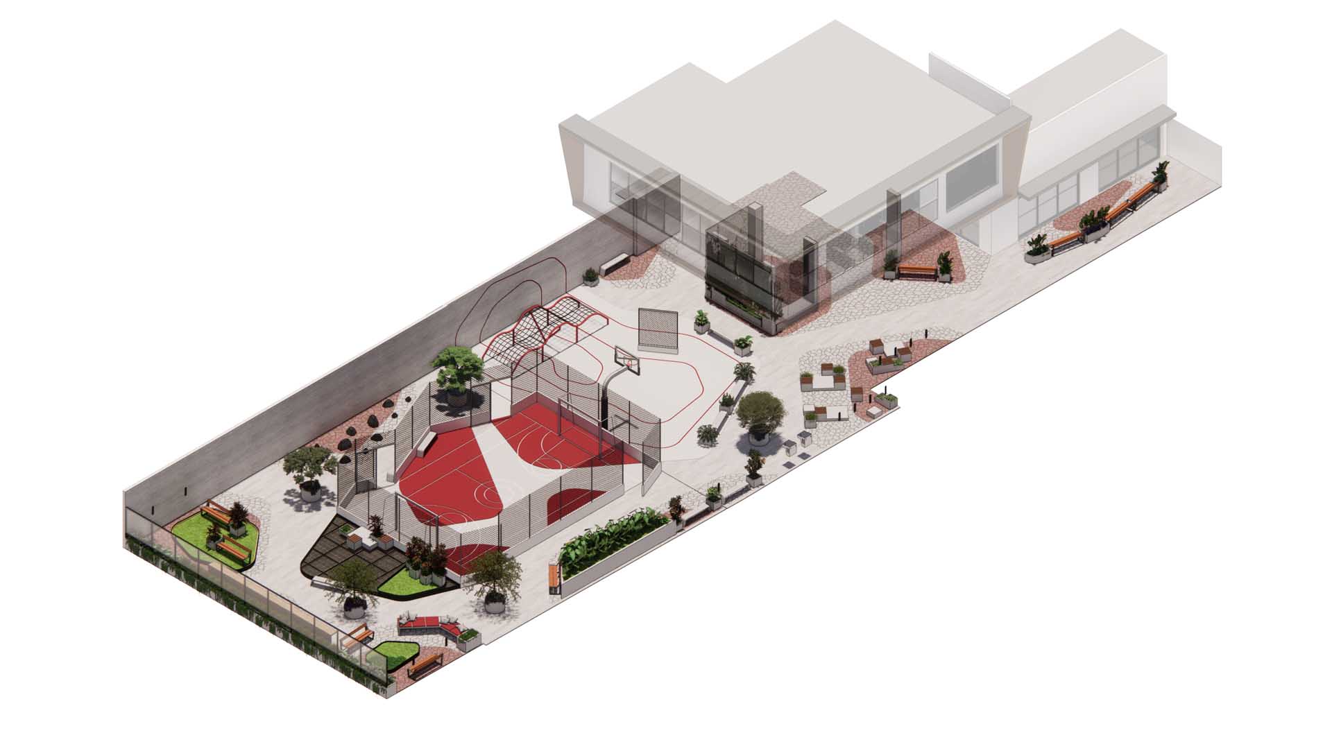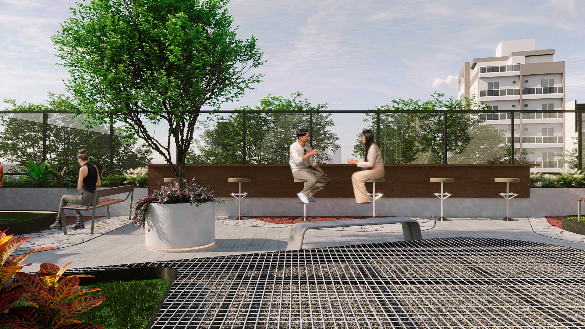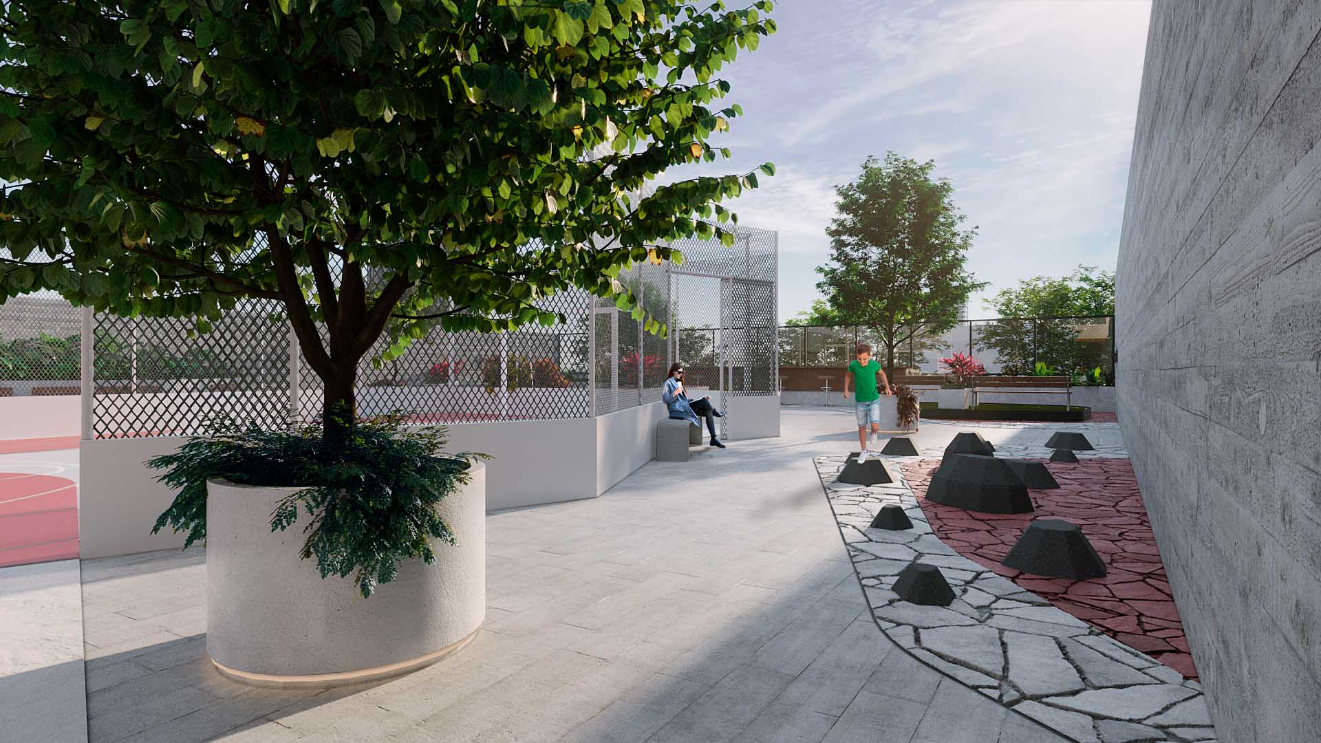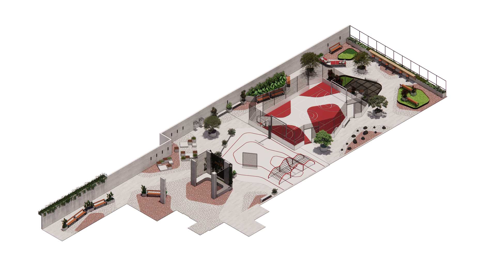 O desenho desse pavimento foi concebido com um traçado dinâmico e não óbvio, que organiza os fluxos e orienta a ocupação dos espaços. Em alguns pontos, a praça se abre para atividades de maior intensidade, como esportes e convivência coletiva. Em outros, se recolhe em áreas de menor intensidade, que convidam à introspecção e ao contato com a rua vegetada do empreendimento.