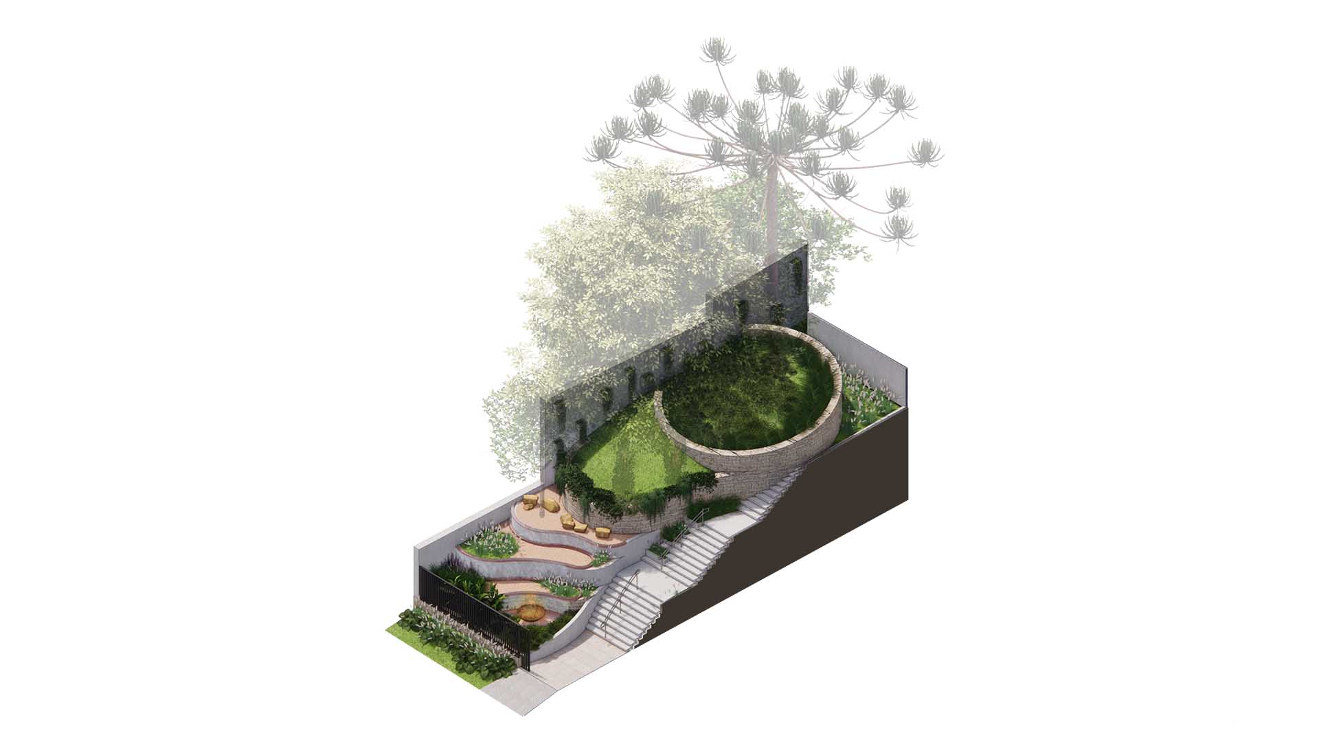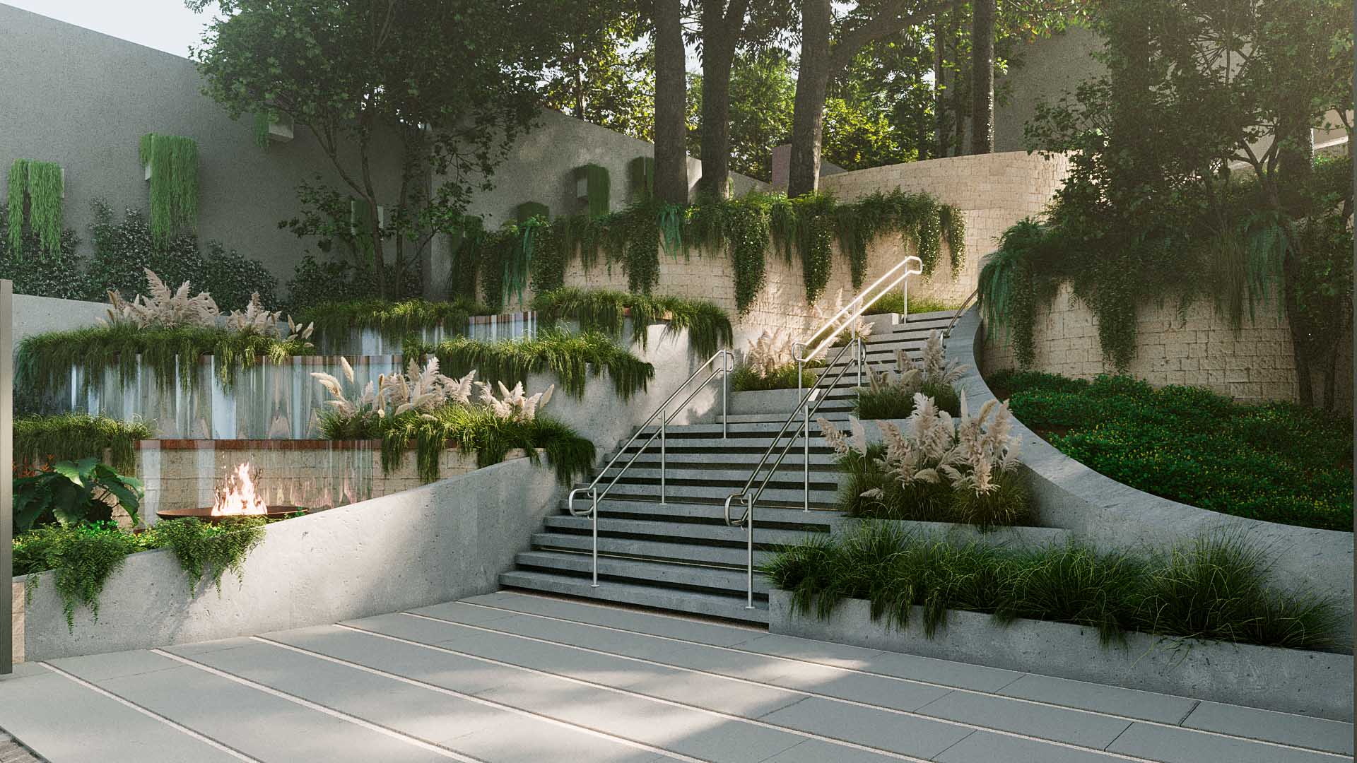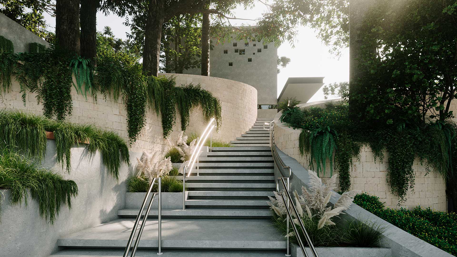 A escadaria central foi desenhada cuidadosamente em função das condicionantes de topografia pré-existente, junto a espécies vegetais nativas que foram mantidas no projeto. Desta forma, se construiu uma paisagem de muros de arrimo que permeiam o natural, ao mesmo tempo em que conduz o visitante em um percurso de ascensão que remete ao Jardim do Éden. Espécies pendentes e gramíneas delicadas suavizam a rigidez dos muros e evocam a ideia de abundância natural. A vegetação não é apenas ornamental, mas simbólica: resgata a ideia de um paraíso perdido e, ao mesmo tempo, presente na memória e na fé.