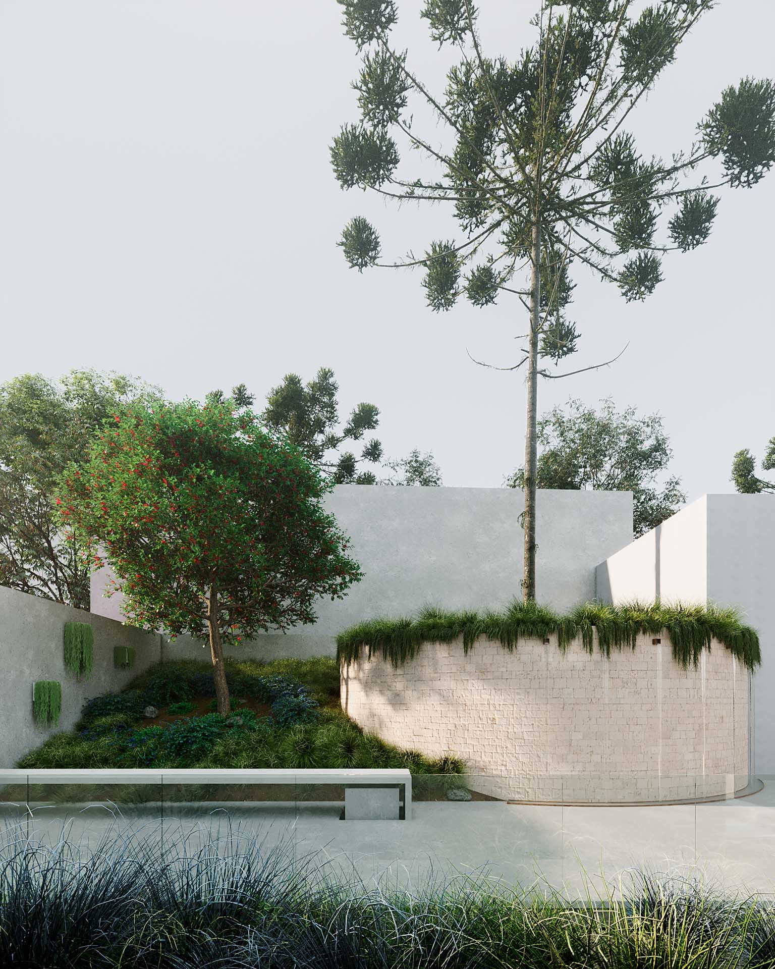 O desenho do espaço valoriza o silêncio e a contemplação. O percurso ascendente, as sombras filtradas das árvores e os detalhes materiais criam uma atmosfera serena, onde a luz desempenha papel central. A paisagem é sóbria, carregada de significados, transmitindo respeito, espiritualidade e acolhimento aos que visitam o lugar.