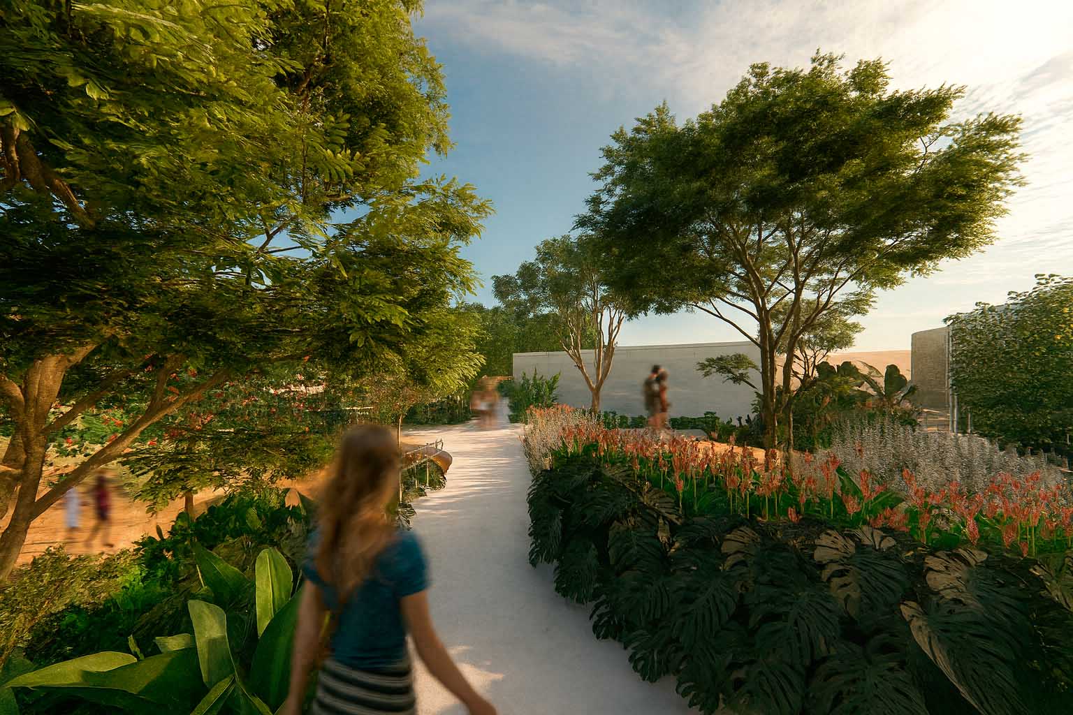 As texturas do projeto se somam em camadas que despertam a percepção sensorial: o piso em areia e pedra contrasta com a densidade das folhagens; a suavidade das flores tropicais se equilibra com a rusticidade dos troncos e galhos; a água, em superfícies tranquilas ou reflexivas, acrescenta frescor e vitalidade. A vegetação utilizada privilegia espécies nativas e adaptadas, capazes de se autorregular e sustentar o equilíbrio ecológico, regulação do solo, baixa manutenção e favorecimento da biodiversidade da fauna local que contribui na restituição de corredores ecossistêmicos.