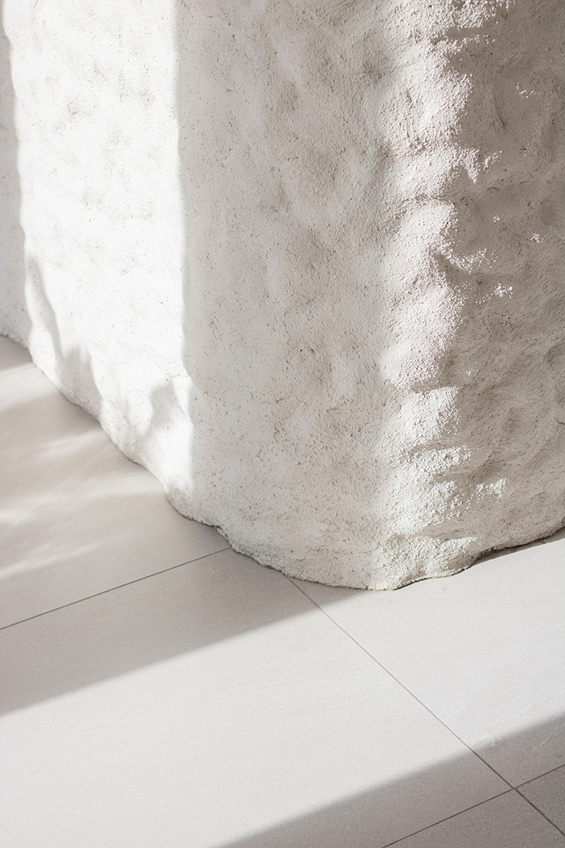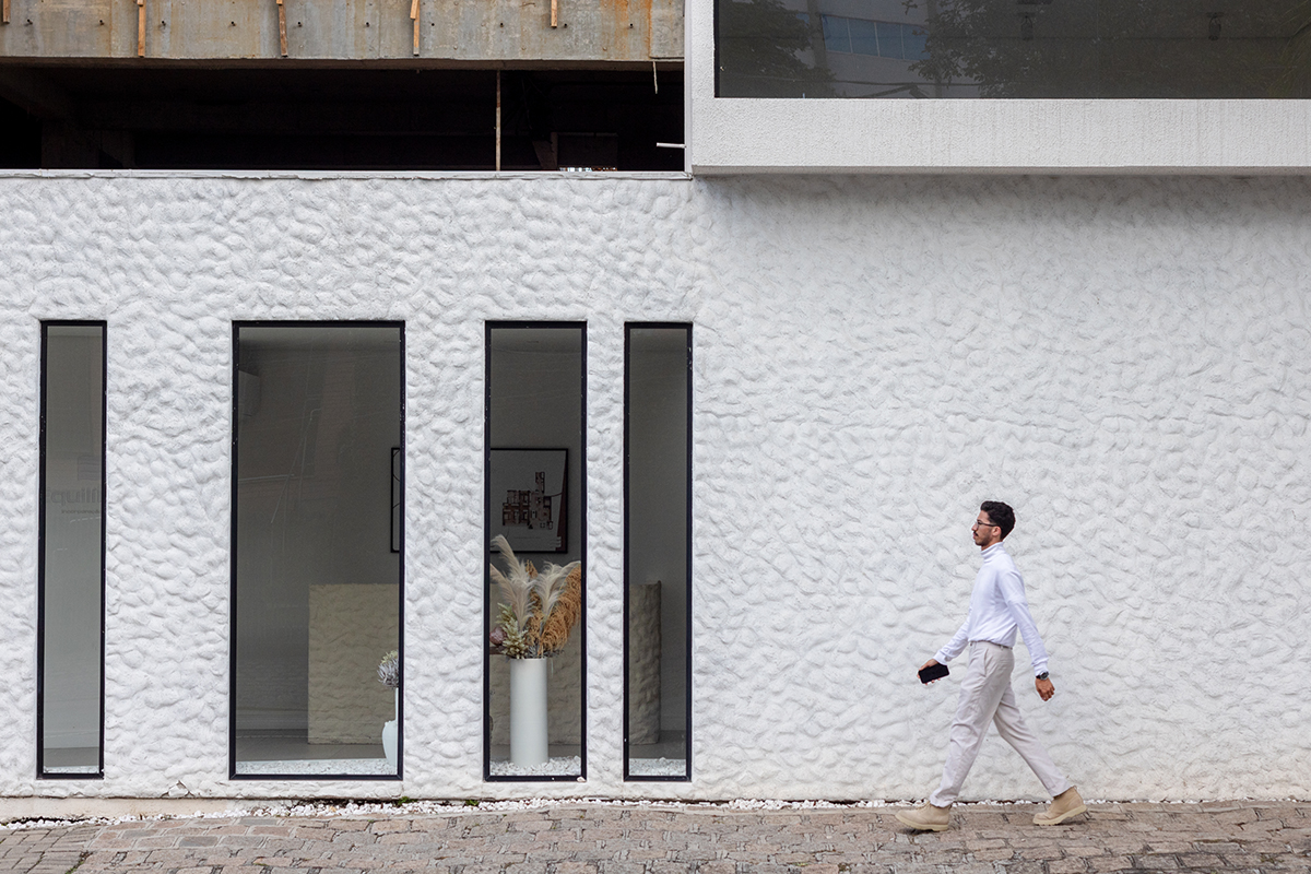 O partido formal surge de um volume puro e imponente, que posiciona a maquete do Blanc como obra de arte, evidenciada por um pé-direito duplo. O volume repousa sobre uma lâmina branca texturizada na fachada, revelando surpresas e exclusividade através de aberturas em fita. Elas quebram a neutralidade, criam ritmo, geram enquadramentos ao longo da fachada e permitem uma iluminação natural estratégica, que desenha luz e sombra sobre o piso, paredes e maquetes, transformando o espaço em um espetáculo sensorial.