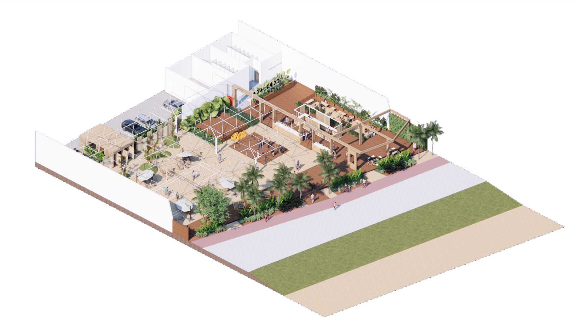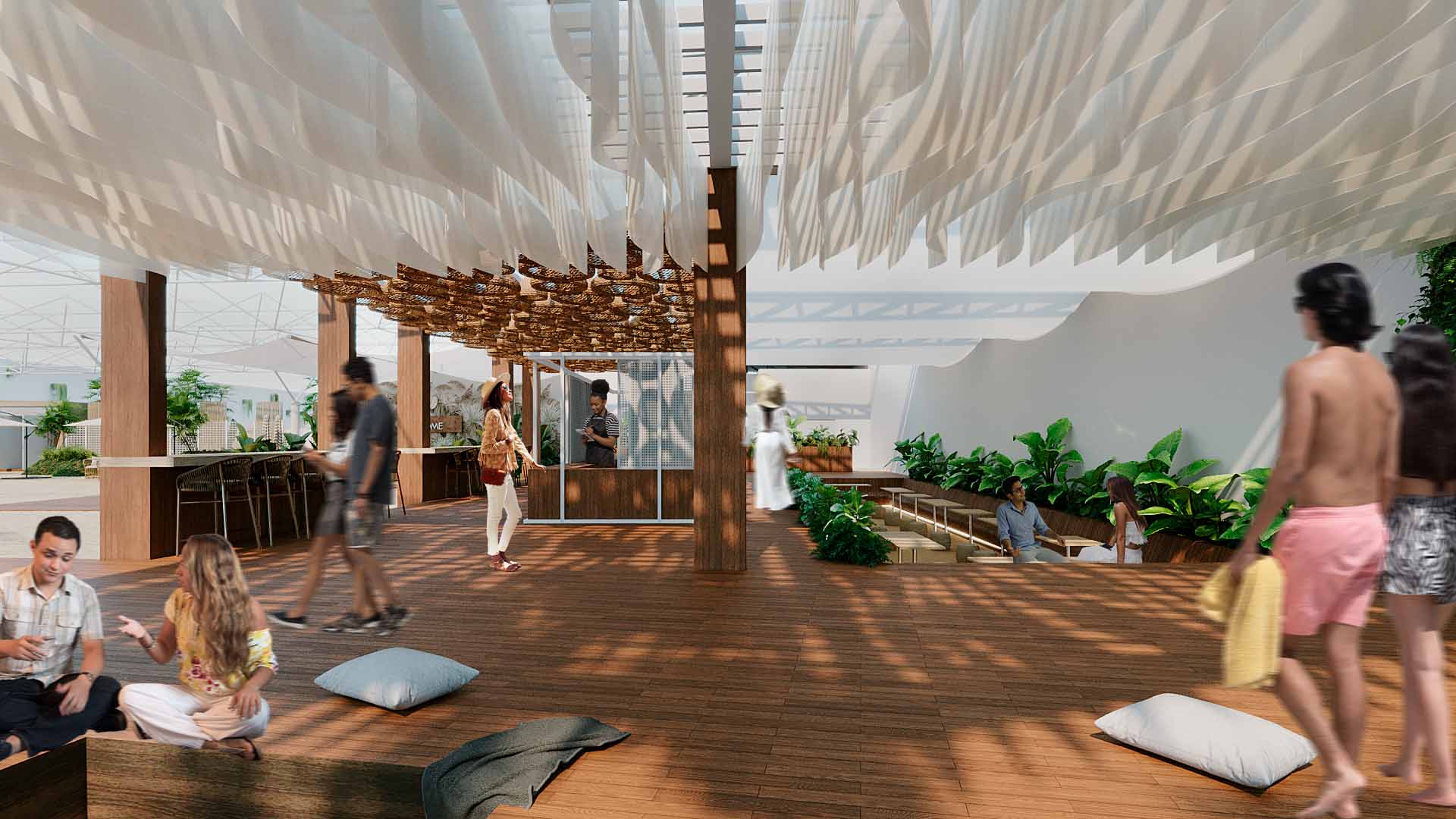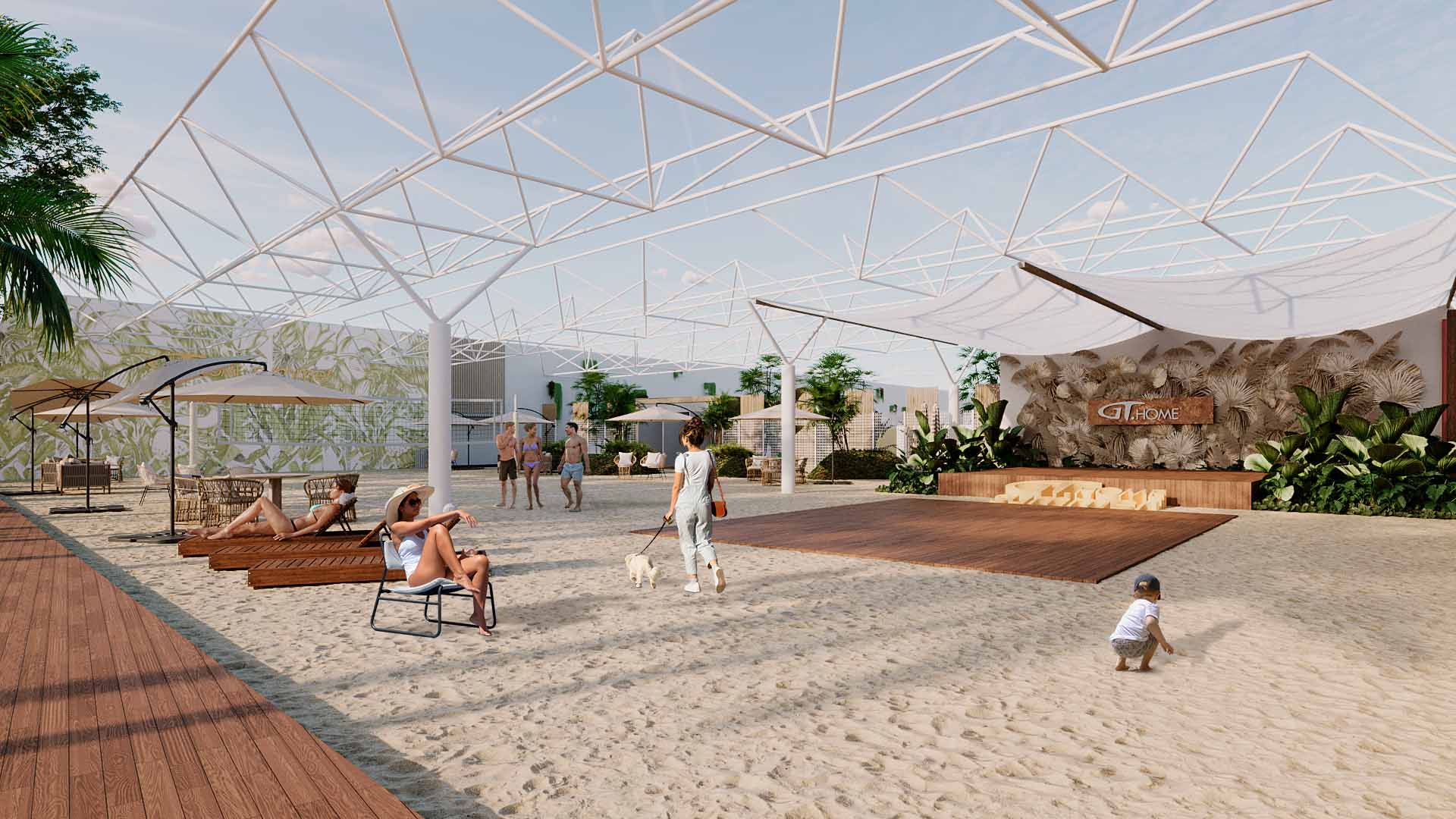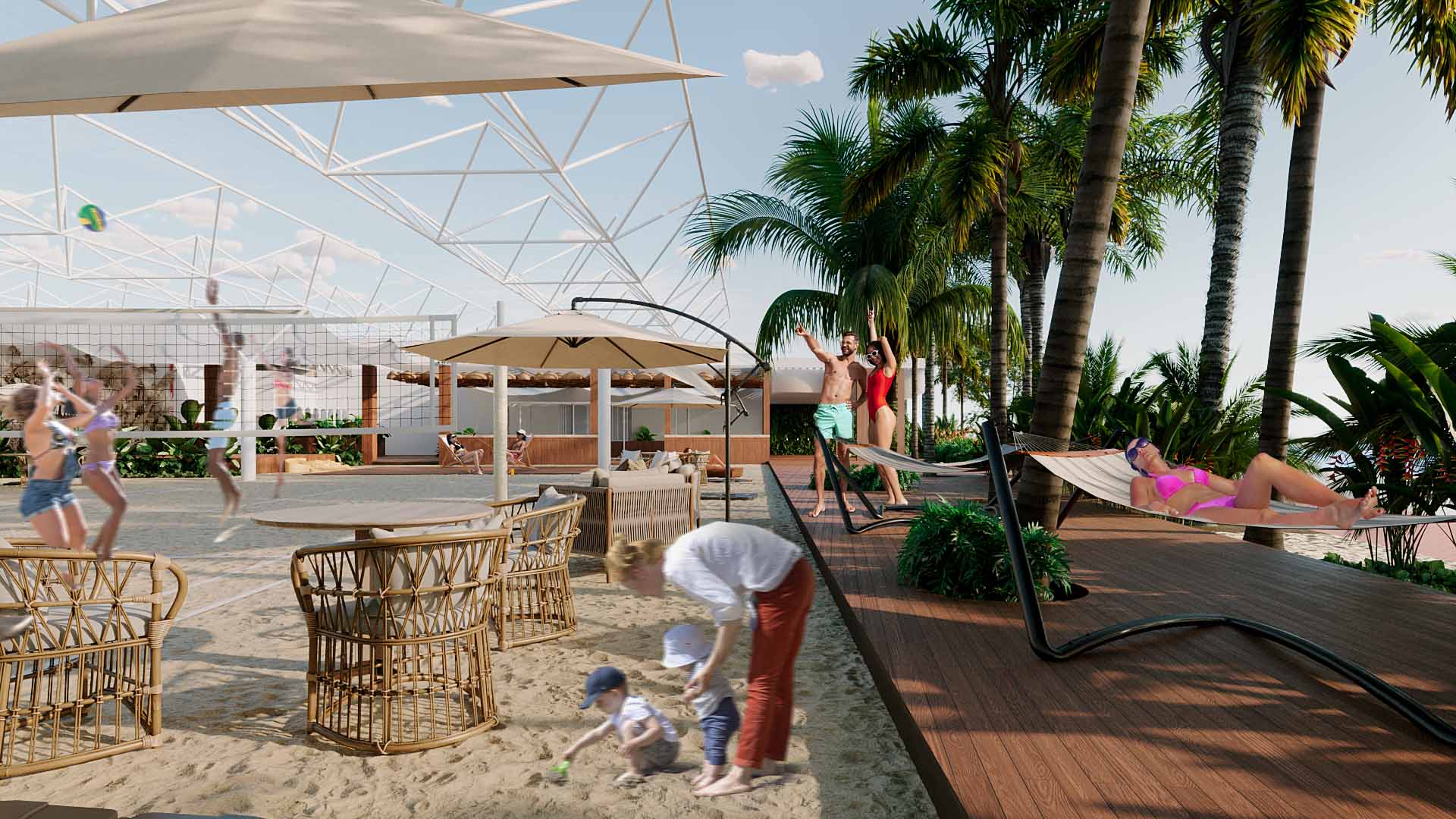 A experiência do usuário é central — jogar vôlei, descansar à sombra, assistir a um show no palco ou simplesmente caminhar descalço na areia. Cada detalhe potencializa o convívio e a sensação de bem-estar coletivo, transformando o espaço em um refúgio vibrante, inclusivo e acolhedor.