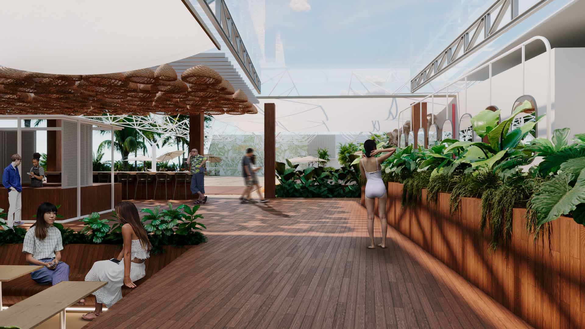 O projeto traduz leveza e tropicalidade: a madeira aquece o ambiente, a vegetação nativa molda percursos e enquadramentos, enquanto elementos claros e permeáveis reforçam a sensação de frescor. As estruturas vegetais atuam não só como ornamento, mas como elementos de criação de planos verticais e integração entre volumes construídos e áreas abertas, dissolvendo limites.
