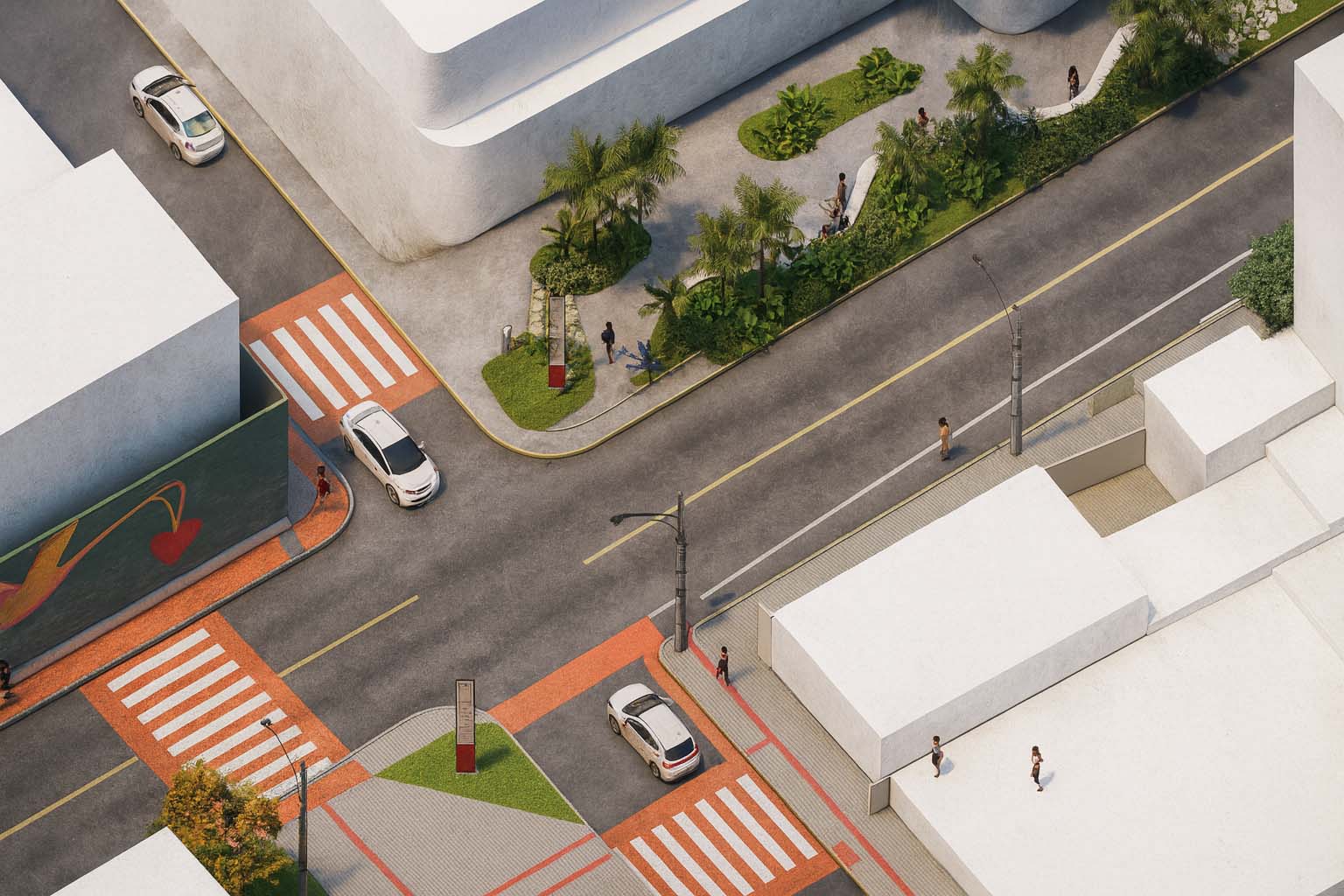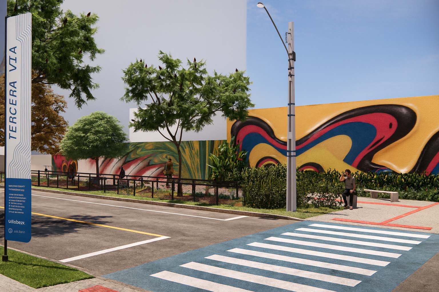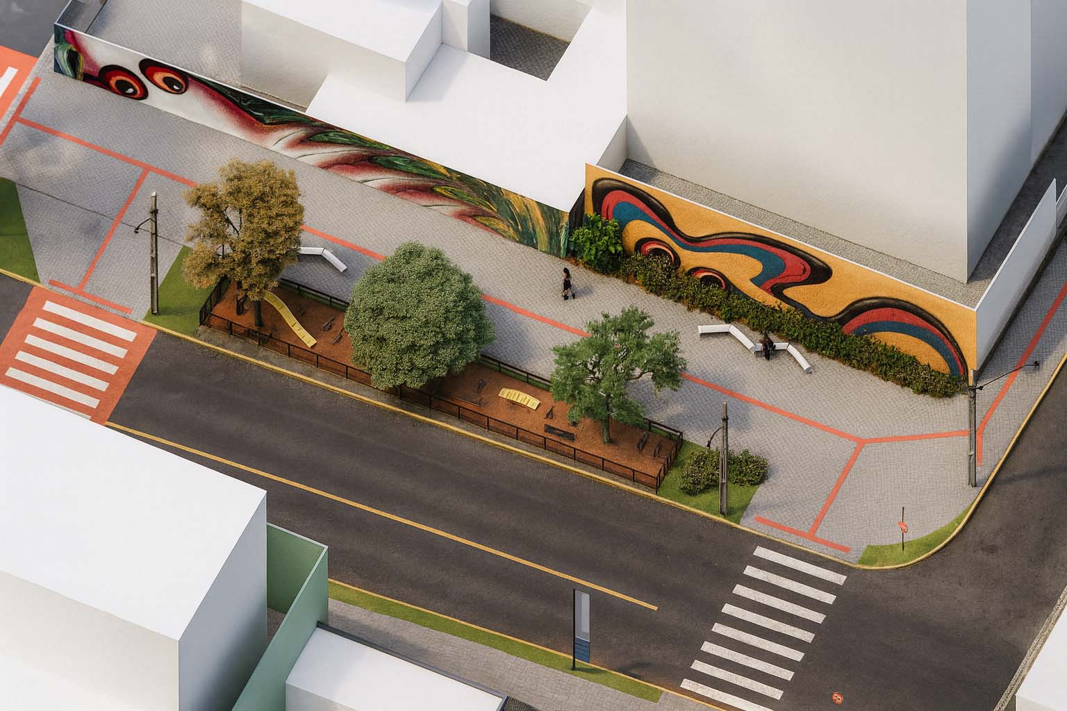 A proposta procurou ressignificar os recortes existentes, transformando-os em micro espaços qualificados. A introdução de mobiliários de estar, bicicletários, áreas para pets e espaços gastronômicos reforça a ideia de diversidade de usos e da rua como palco da vida cotidiana. O desenho do piso, as pinturas que ampliam calçadas e as travessias em destaque criam continuidade e promovem segurança ao pedestre, enquanto a arte urbana nas empenas acrescenta identidade e caráter lúdico. Esses elementos se articulam para transformar a avenida em lugar de convivência, estimulando a apropriação pelos diferentes públicos.