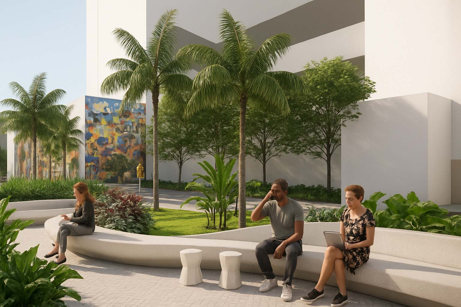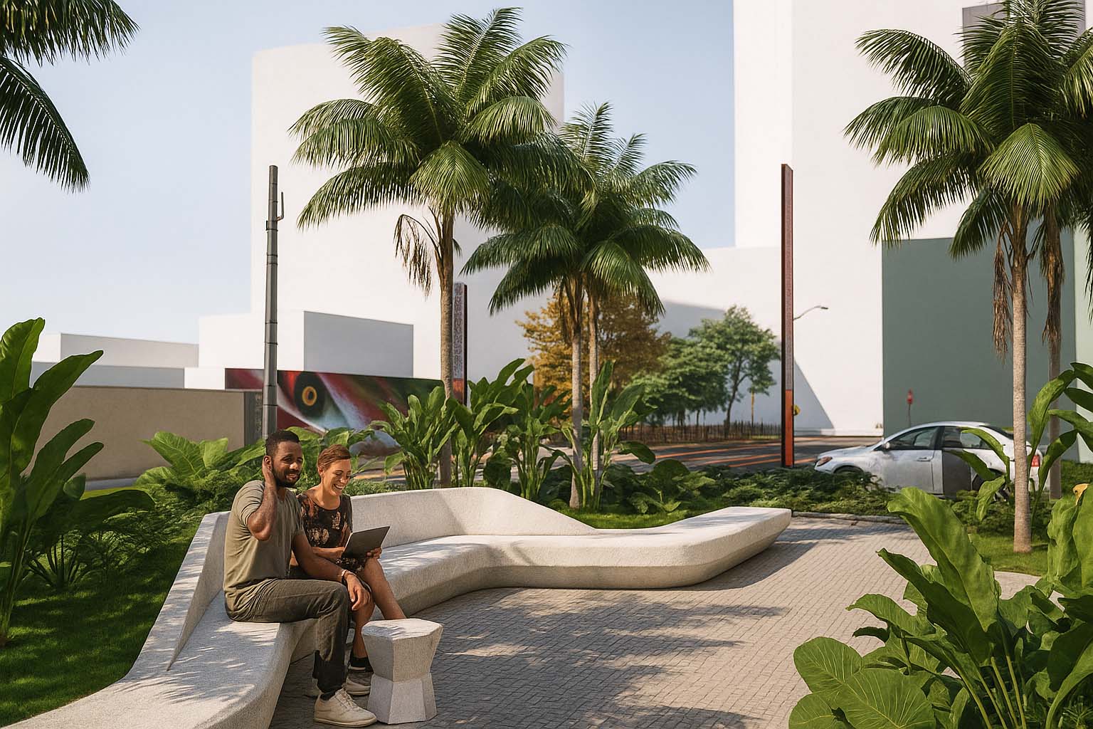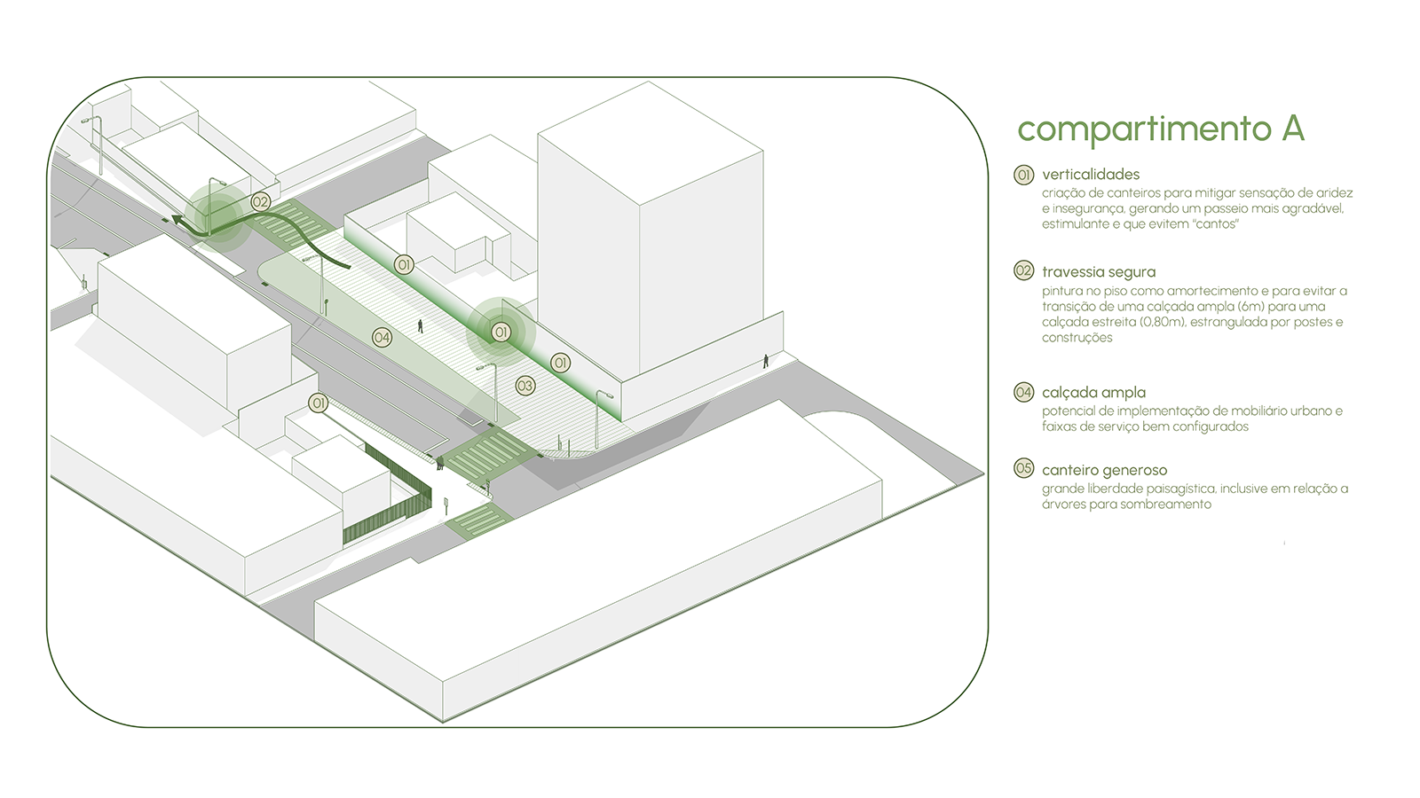 A proposta procurou ressignificar os recortes existentes, transformando-os em micro espaços qualificados. A introdução de mobiliários de estar, bicicletários, áreas para pets e espaços gastronômicos reforça a ideia de diversidade de usos e da rua como palco da vida cotidiana. O desenho do piso, as pinturas que ampliam calçadas e as travessias em destaque criam continuidade e promovem segurança ao pedestre, enquanto a arte urbana nas empenas acrescenta identidade e caráter lúdico. Esses elementos se articulam para transformar a avenida em lugar de convivência, estimulando a apropriação pelos diferentes públicos.