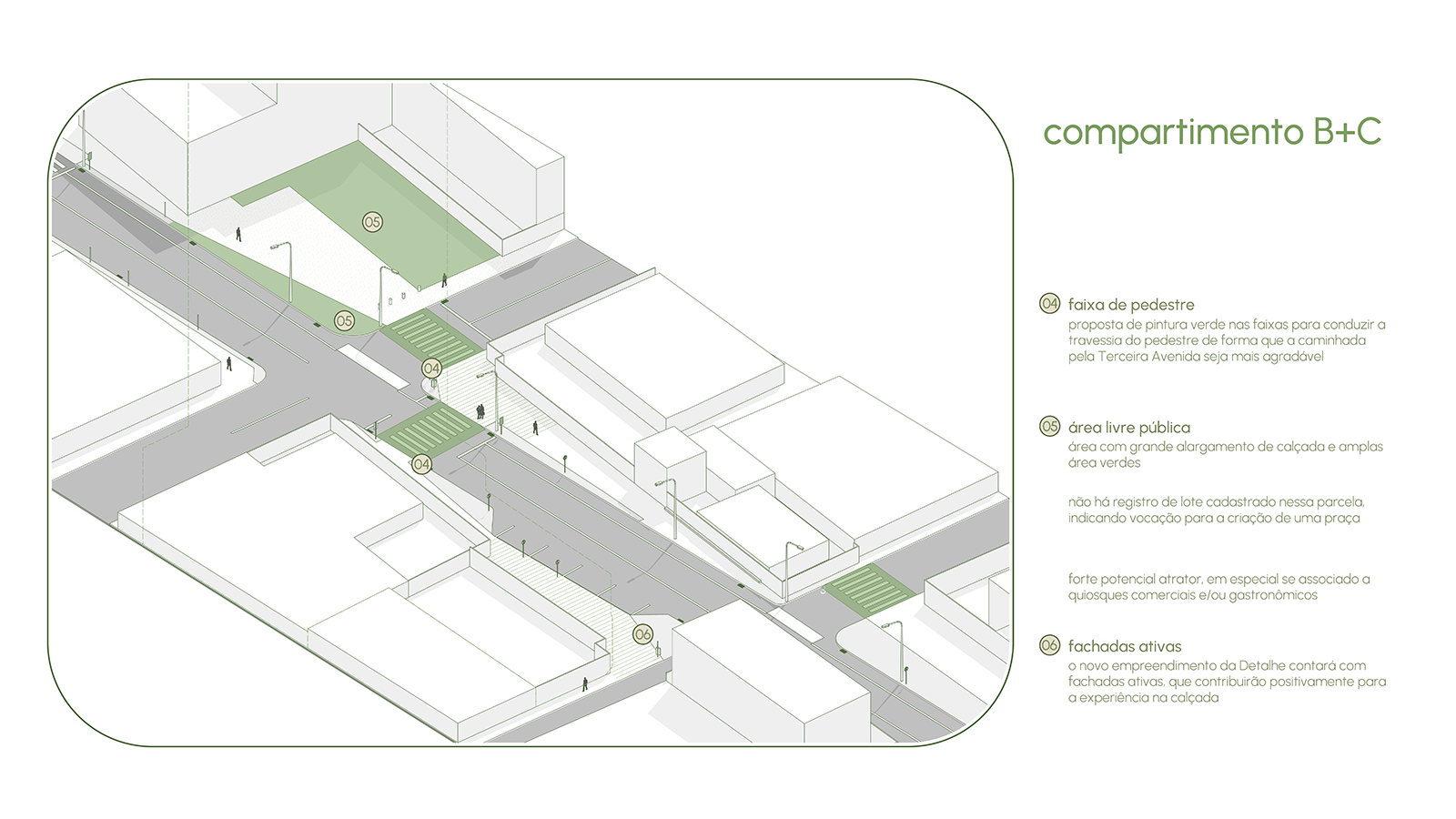O resultado é um desenho urbano que equilibra clareza técnica e sensibilidade, capaz de transformar um eixo viário árido em sequência de lugares vivos. A Terceira Avenida deixa de ser apenas passagem e se converte em destino, onde cada curva revela novas oportunidades de encontro, permanência e reconhecimento da paisagem. Mais do que uma intervenção espacial, o projeto afirma uma nova forma de pensar e fazer cidade: uma avenida que pulsa no ritmo da vida urbana, aberta à diversidade e atenta ao bem-estar coletivo.