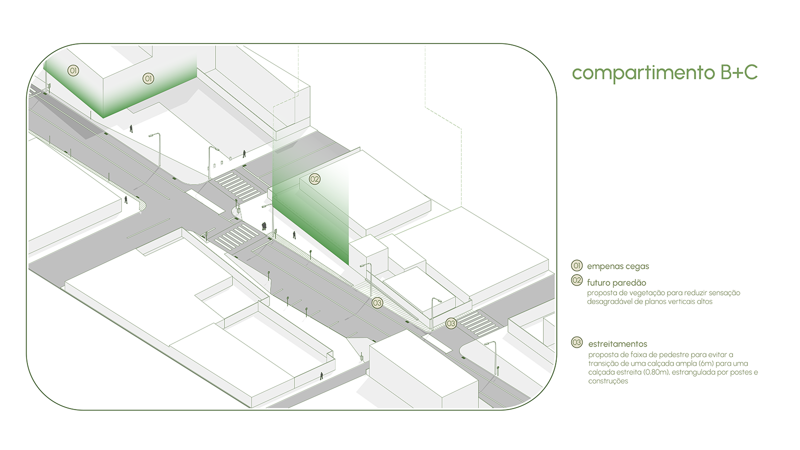 O projeto de desenho urbano para a Terceira Avenida nasce do reconhecimento da sua condição fragmentada e da potência escondida em seus interstícios. O estudo preliminar revelou trechos marcados por empenas cegas, calçadas estreitas, espaços áridos e pouco atrativos, mas também identificou aberturas que poderiam se transformar em áreas de permanência, encontro e vitalidade urbana. A partir dessa leitura, o conceito estruturador foi o de requalificação como prática de reconectar pessoas e lugares, devolvendo à avenida uma escala mais humana e convidativa.